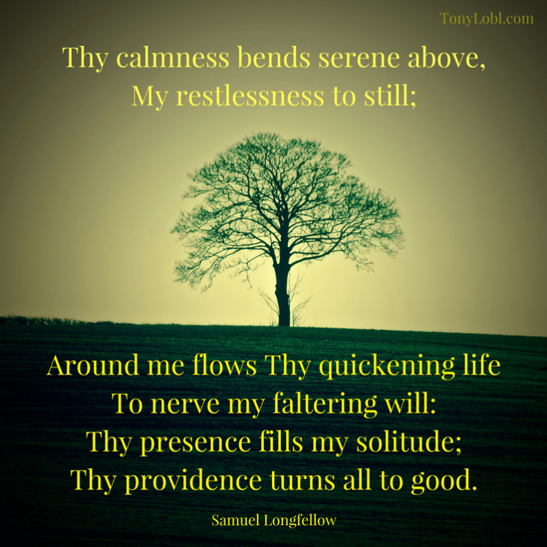Thy calmness bends serene above, My restlessness to still; Around me flows Thy quickening life To nerve my faltering will: Thy presence fills my solitude; Thy providence turns all to good.