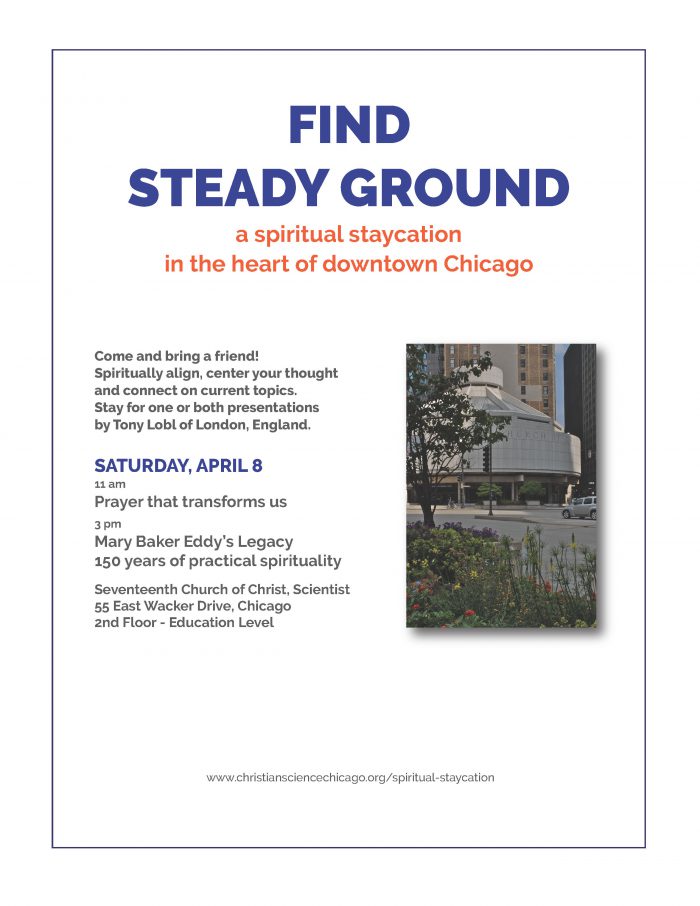 I have been invited to the windy city to present both my lectures in one day. So if you want to hear “Prayer that transforms us” (11am) or “Mary Baker Eddy’s legacy: 150 years of practical spirituality” (3pm) come along and join us next Saturday (April 8), at the architecturally renowned Seventeenth Church of Christ, Scientist, Chicago..
